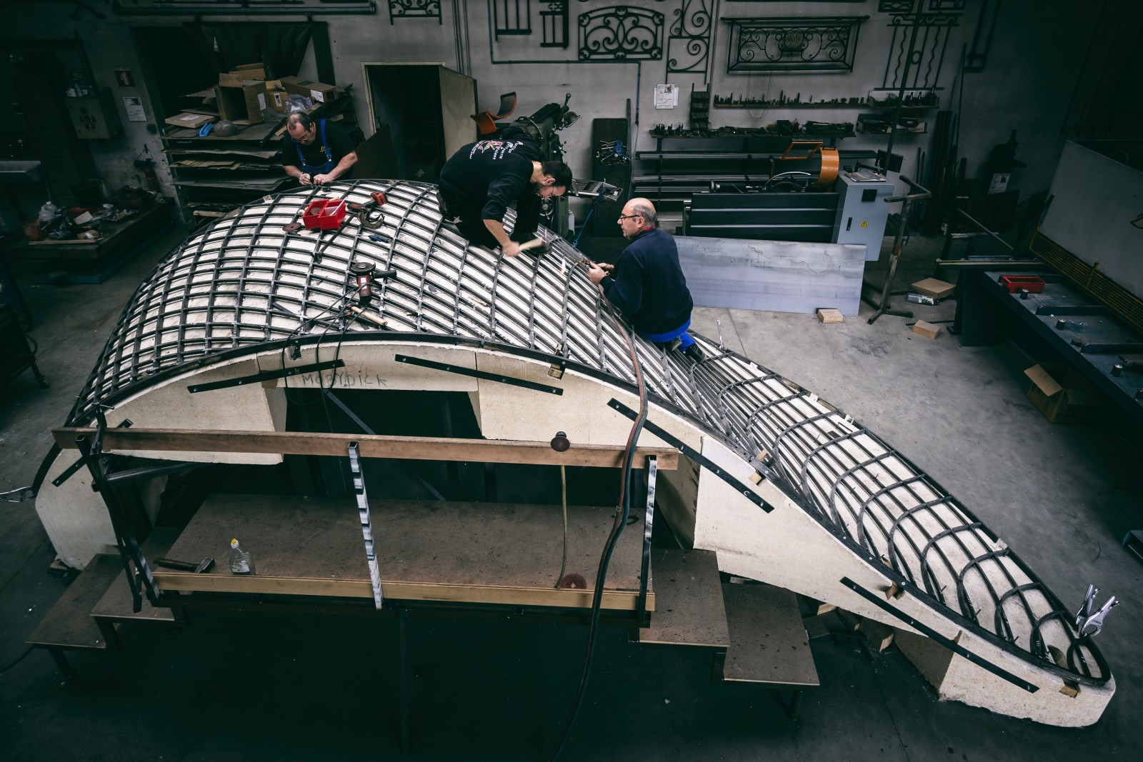 Dès l'arrivée, le regard du visiteur est immédiatement attiré par l'élément architectural clé du projet, l'escalier, qui donne le ton de ce nouveau projet. Véritable tour de force, les rouages techniques de l'escalier sont totalement cachés, à l'instar du célèbre serti mystérieux™ de Van Cleef & Arpels qui offre une mise en scène invisible et précieuse. L'escalier est constitué de sept gros blocs fraisés numériquement, la structure est percée en son milieu et un câble suspendu à travers la pierre percée confère à la structure sa rigidité, telle une colonne vertébrale. La main courante, quant à elle, donne sa présence à l'escalier : réalisée en fer forgé, autre matériau typiquement parisien, son dessin s'inspire des ailes d'un papillon. Malgré la solidité du matériau, la structure est d'une incroyable légèreté. Délicatesse et transparence, impression de mouvement... telles sont les idées qui ont présidé à la conception de cette pièce unique. L'escalier accueille le visiteur dès le premier regard, sa forme organique et généreuse l'invitant à monter à l'étage où il découvre une suite de salons évoquant un appartement parisien. Au pied de l'escalier, une haute vitrine ovale au couvercle allongé en verre taillé et bombé joue avec la lumière et l'éclat des bijoux.
